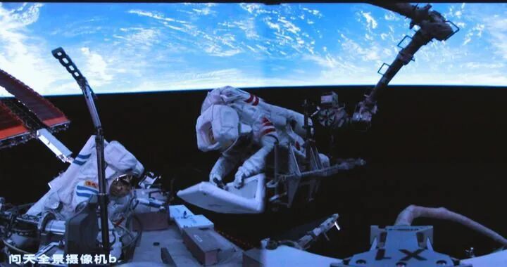 這是2025年6月26日在北京航天飛行控制中心屏幕上拍攝的神舟二十號航天員陳冬(左)與陳中瑞在空間站組合體艙外工作的畫面。新華社發(fā)(周柯毅 攝)